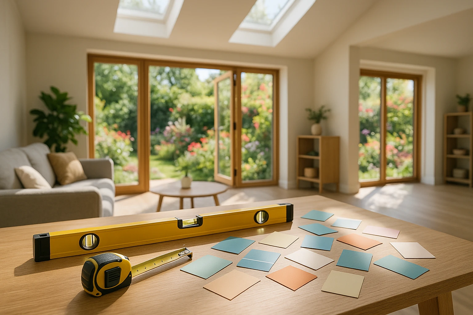 <figcaption style="margin-top: 0.5rem; font-size: 0.9em; color: #666; font-style: italic;">A sunlit open-plan living area with large skylights and wide glass doors leading to a blooming garden, featuring construction tools like a level and measuring tape on a wooden table, and fresh paint swatches scattered around.</figcaption>