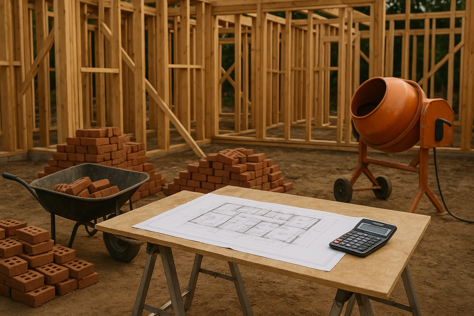 <img src="https://assimetria-public.s3.amazonaws.com/articles/1228/content_2_rKAoNzq2k3x1DpP.webp?AWSAccessKeyId=AKIAQ3EGPZQMPMGTD2PZ&Expires=2078801057&Signature=6OxZxw8Ya3vE4%2BODPfk5KteR60w%3D" alt="A construction site with wooden framing and piles of bricks, surrounded by tools like a wheelbarrow and cement mixer, with blueprints and a calculator lying on a makeshift table made of sawhorses and plywood in the foreground." style="max-width: 100%; height: auto; border-radius: 8px;" />